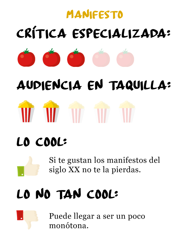 Mediante una serie de asombrosos personajes e impactantes monólogos, Cate Blanchett conmemora la tradición y la perfección de los Manifiestos Artísticos.