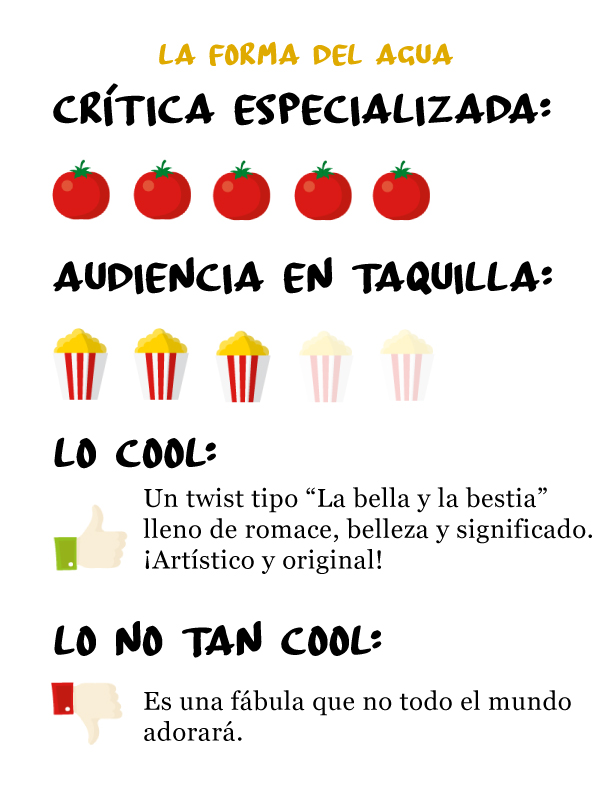 Ganadora a Mejor Director, La forma del agua es una historia fantástica que se sitúa en la época de la Guerra Fría de los Estados Unidos por el año de 1963, donde en un laboratorio secreto de alta seguridad, trabaja una joven sorda que descubre una mística criatura marina que mantienen ahí atrapada y con la que mantendrá una muy estrecha relación.
