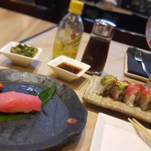 Sin duda tienes que probar  los sashimis como entrada para después continuar con los veggie gyoszas o un dragón roll y para el postre, es perfecto la “Bomba Bocku” , un soufflé horneado relleno de chocolate líquido con helado de vainilla a un lado.